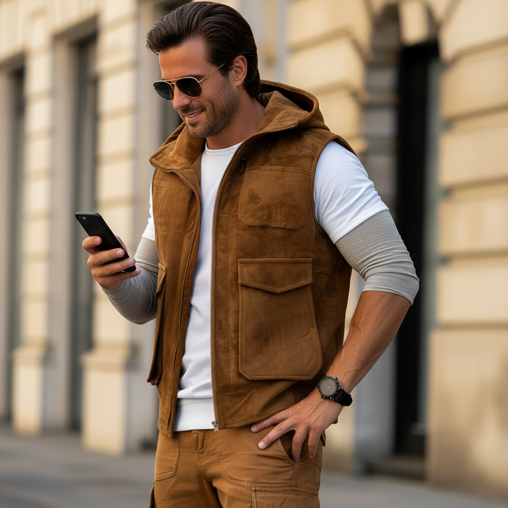Man wearing a brown vest over a white shirt with a blurred background
